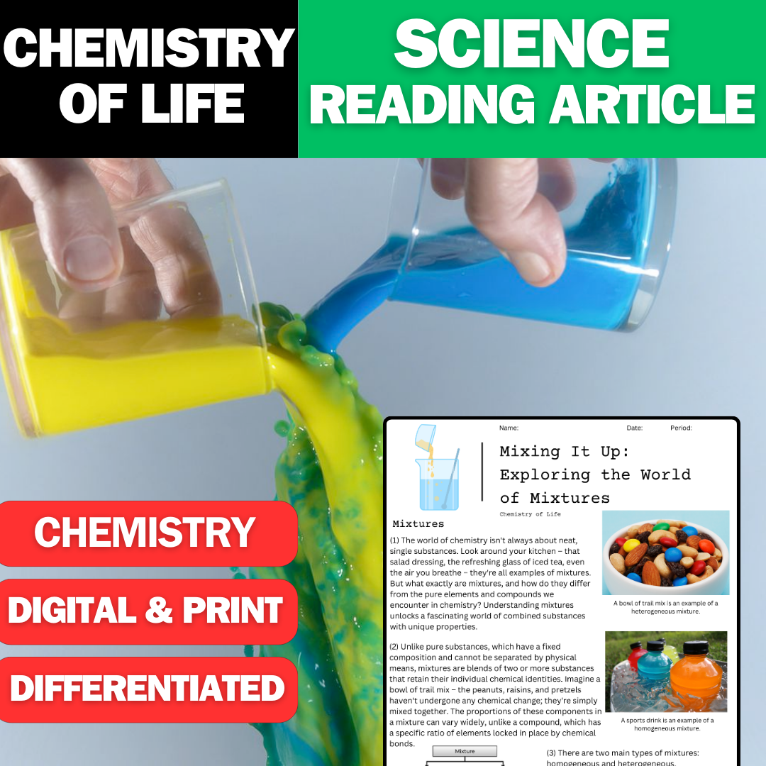 Looking to encourage reading in your chemistry class focused on homogeneous mixtures, heterogeneous mixtures, pure solutions, solutions, substances, and distillation? This engaging science article over the chemistry of everyday life will spark the curiosity of all learners! Start discussions and a love for science with interesting chemistry, reactions, relatable concepts, and explanations. Develop literacy skills, tie science to the world around them, and foster a desire to look for answers.